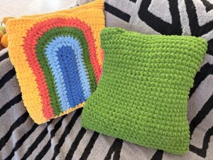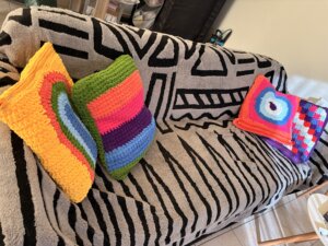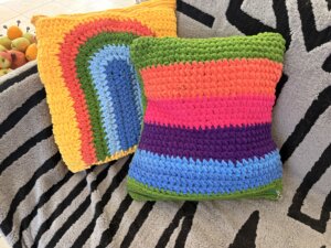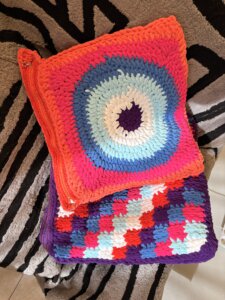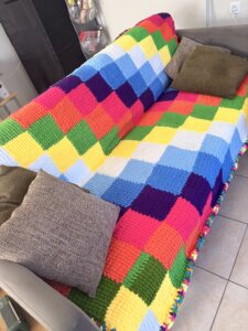 Tak, uszydełkowałam ( jest takie słowo w ogóle czy je właśnie stworzyłam?) pokrowce na poduszki. Teraz cała sofa wygląda jak tęcza po dopalaczach. Wchodzisz do salonu i masz wrażenie, że krzyczy do ciebie: „Uśmiechaj się! Albo przynajmniej załóż okulary przeciwsłoneczne!”.
