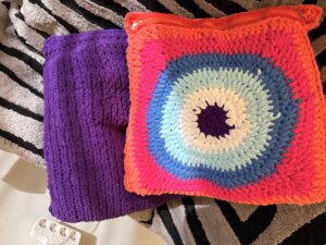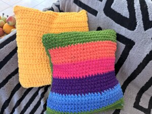 Zostało mi sporo włóczki. Niektóre kolory w resztkach, inne w ilości wystarczającej na mały namiot. A że na sofie mam cztery ozdobne poduszki, które nijak nie pasowały do nowego koca, to wiesz, co zrobiłam.