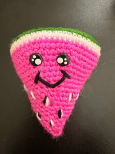 I wtedy, kiedy już miałam wszystko skończone, spojrzałam na tę całą szydełkową sałatkę i przypomniałam sobie, że moja córka bardzo, ale to bardzo lubi arbuzy. Wiem, arbuz to nie warzywo. Ale kto powiedział, że w szydełkowym świecie obowiązują zasady botaniki? Zrobiłam więc arbuza. Soczystego, kolorowego, z pestkami i charakterem.