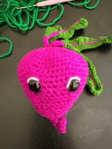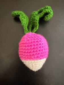 Najpierw powstał zielony groszek, bo kulki są zawsze wdzięczne do robienia. Potem dodałam paprykę, bo jej kształt i kolor to istna szydełkowa poezja. Marchewka pojawiła się niemal automatycznie. Nie da się zrobić kolekcji warzyw bez marchewki, to by było po prostu nieprzyzwoite. Rzodkiewka wkradła się cichaczem, bo ma w sobie ten uroczy kontrast kolorów i wygląda trochę jak emoji, co wzbudziło mój szydełkowy entuzjazm. Do tego dołączył burak – ciemny, dramatyczny, pełen głębi i charakteru. Następnie dynia, bo przecież każda szydełkująca osoba wcześniej czy później robi dynię. To jak chrzest bojowy.