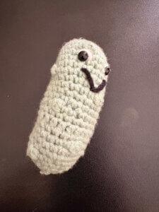 Skoro już zrobiłam jednego, to pomyślałam sobie, że mogłabym zrobić też większego, nieco bardziej ozdobnego. Taki mógłby sobie stać na półce i dumnie prezentować swoją warzywną formę. A skoro już byłam w ogórkowym szale, to sięgnęłam jeszcze po grubszą, pluszową włóczkę i stworzyłam ogórka w rozmiarze przytulankowym. Wyszedł miękki, puchaty i całkiem przytulny. Teraz można go używać jako zabawkę, poduszkę albo… po prostu ogórka w wersji luksusowej. Nie wiem, jak do tego doszło. Ale w pewnym momencie uświadomiłam sobie, że stworzyłam ogórkową rodzinę. Najmniejszy to wersja “na wynos”, średni ogórek to typ “do domu”, a największy no cóż, to już ogórek premium.