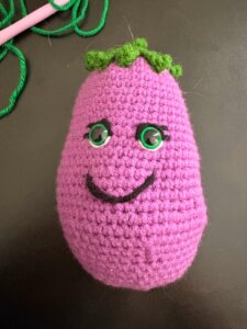 A skoro już mowa o warzywach o ciekawych kształtach, nie mogło zabraknąć oberżyny. Tak, wiem. To właśnie ta oberżyna. Ale nie patrzmy na nią przez pryzmat internetu. To naprawdę bardzo wdzięczne warzywo do szydełkowania. Eleganckie, błyszczące, lekko zakrzywione. W sam raz, żeby dodać trochę szydełkowego dramatyzmu.