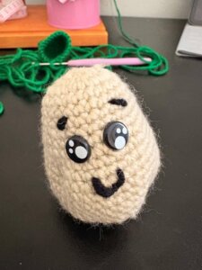 Córka była zachwycona. I wtedy przypomniała mi o ziemniaku. On również znalazł się na jej liście szydełkowych życzeń. Zrobiłam więc ziemniaka zgodnie z zamówieniem. Przyznam szczerze, że nie było to najbardziej ekscytujące doświadczenie. Ziemniak nie należy do najbardziej charyzmatycznych warzyw pod względem wyglądu. Jest brązowy. Jest owalny. I nie oferuje zbyt wielu wizualnych atrakcji. Ale szydełkowa misja to szydełkowa misja, więc powstał ziemniak. Był prosty, skromny, ale całkiem sympatyczny w swojej ziemniacznej nudzie.